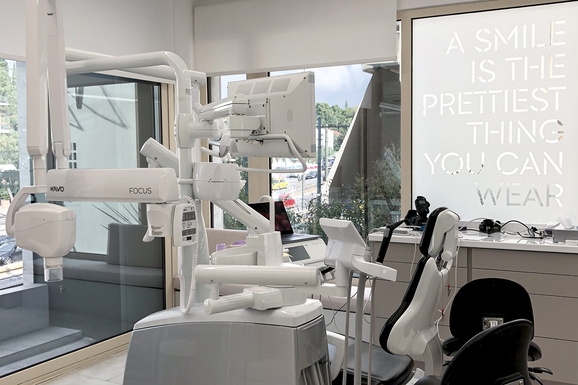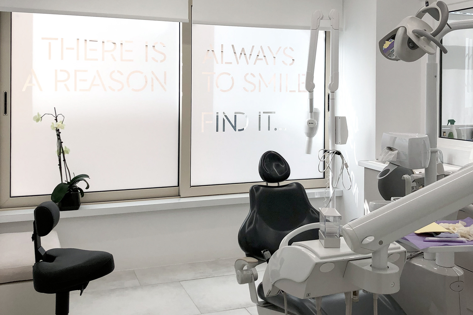 The visual language extends into the clinic through typography applied across the treatment room windows.