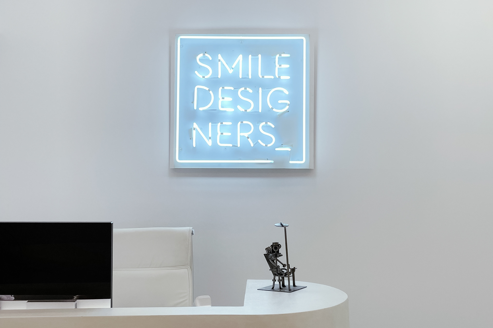 Set in white neon on a white panel, the signage echoes the clinic’s all-white interior with a quiet, atmospheric presence.